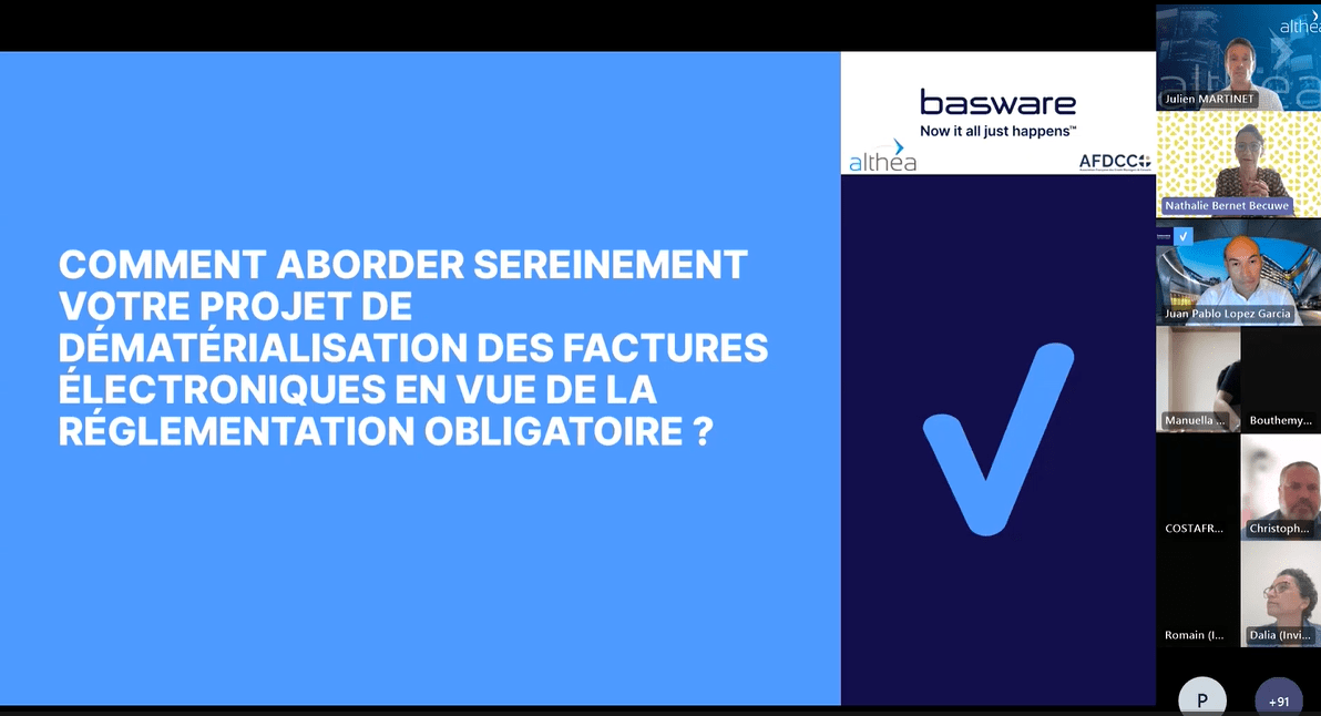 Mercredi 13 septembre 2023, Althéa, Basware et l’AFDCC organisaient un webinar animé par Juan Pablo LOPEZ GARCIA, Responsable Partenariats France & UK, Basware et Julien Martinet d’Althéa. L’objectif ? Clarifier le contexte autour de la dématérialisation des factures électroniques.